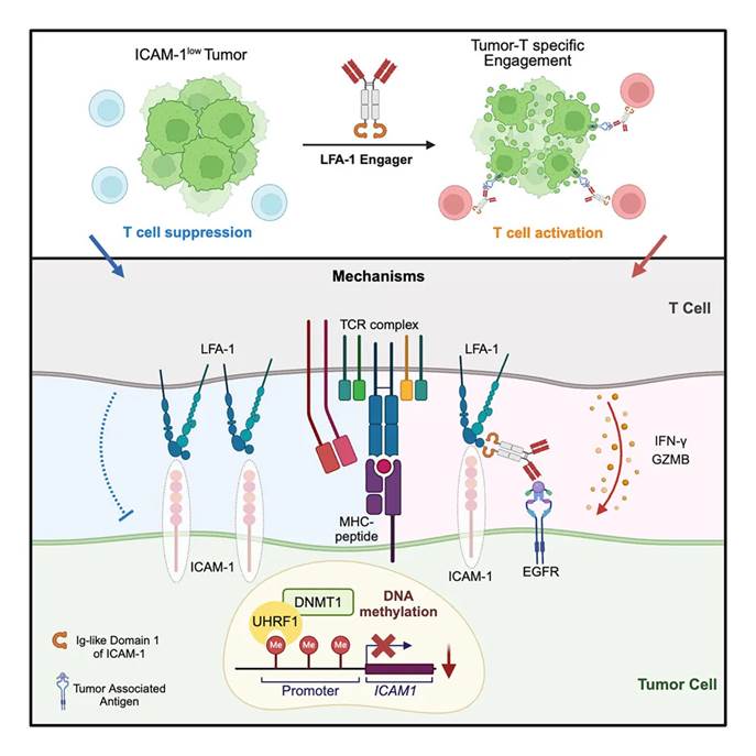 2025年2月24日,清华大学基础医学院潘登以及北京大学定量生物学中心曾泽贤团队合作,在Cell Reports Medicine上发表了题为“Potentiating anti-tumor immunity by re-engaging immune synapse molecules”的研究论文,发现肿瘤通过抑制免疫突触/共刺激分子ICAM-1的表达介导了肿瘤的免疫逃逸。在分子机制方面,通过CRISPR全基因库筛发现,肿瘤ICAM-1的表达受到UHRF1/DNMT1所涉及的DNA甲基化途径的负调控。为克服这种免疫逃逸,研究团队设计了一种名为“LFA-1接合器”的新型双特异性抗体。这种抗体能够在肿瘤与T细胞表面重塑ICAM-1/LFA-1信号轴,从而提升T细胞对肿瘤细胞的杀伤能力。在小鼠荷瘤模型中,LFA-1接合器显著增强了免疫细胞介导的细胞毒性与效应功能,并与免疫检查点阻断(ICB)疗法产生了协同效应。