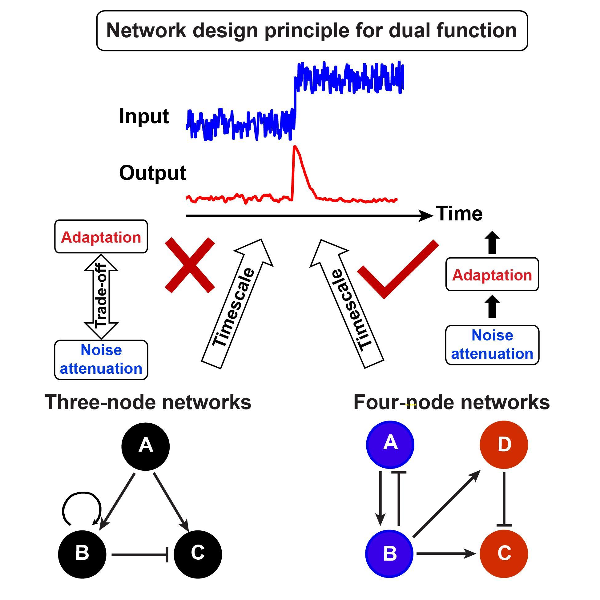 许多生物系统需要在噪声环境下实现适应性,但生物网络同时实现适应性和抗噪性双功能的机制尚不清楚。以往针对适应性与抗噪性的研究多局限于特定的生物网络,张磊课题组则试图回答一个更为基本的问题:什么样的网络拓扑能够实现“适应-抗噪”双功能?如果这样的网络存在,那么其内在的设计原理是什么?