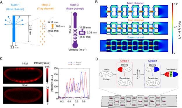 图2果蝇胚胎多标蛋白定量成像微流系统。(A)芯片设计(B)模拟结果成像(C)洗脱实验结果(D)多标染色流程示意图。