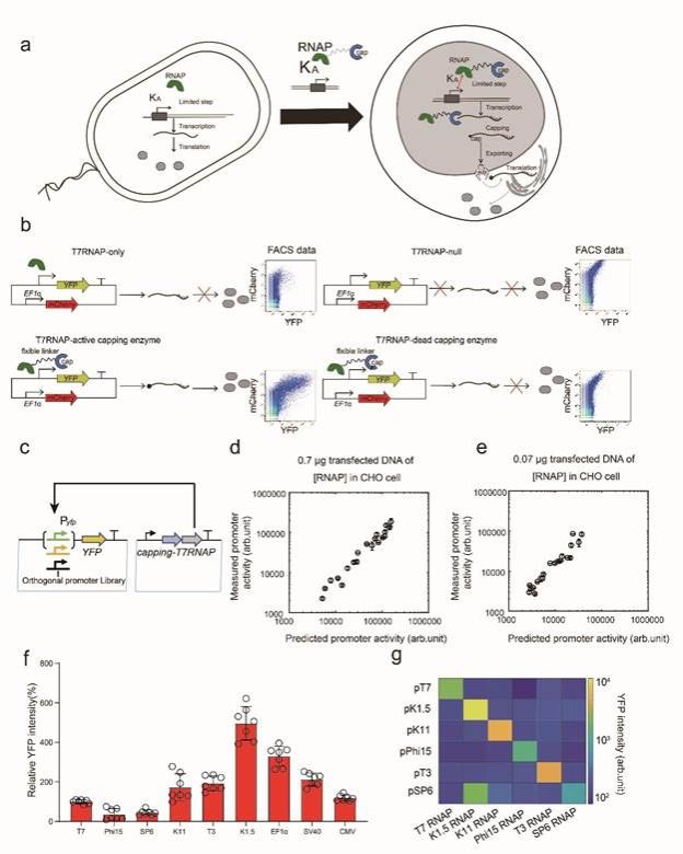 本文提出一种设计策略,旨在开发一种模块化、独立于宿主的正交型转录系统。该正交型转录系统由正交型启动子库和单体RNA聚合酶(RNAP)组成。该系统通过将RNA加帽酶与单体RNAP融合,确保病毒来源的单体RNAP在哺乳动物细胞中按照“跨域(domain)”方式实现基因转录、转录后修饰、出核和翻译等真核系统蛋白质表达的必需步骤(图1)。
