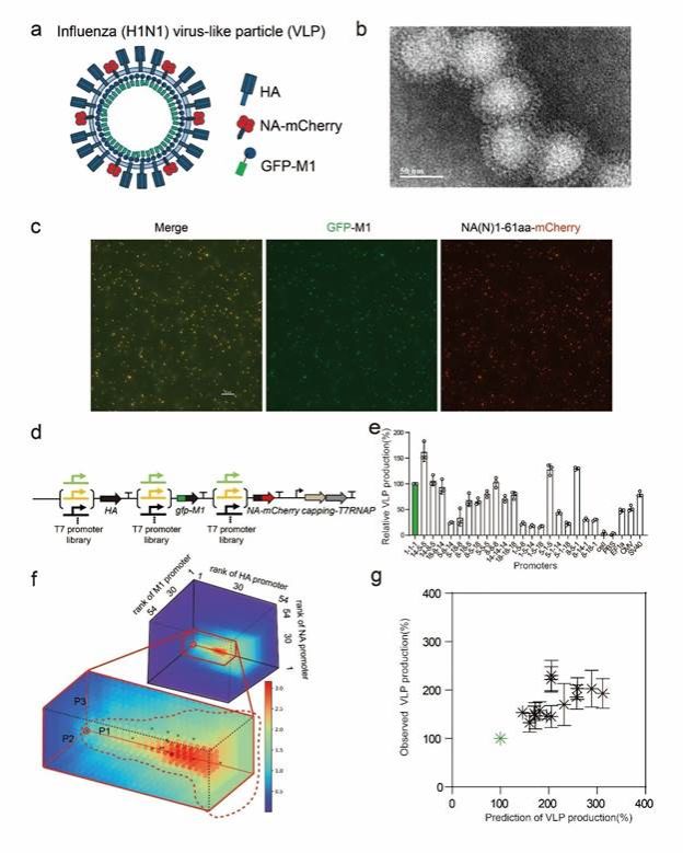 为证实正交转录系统的优势,研究团队使用定量模型优化了病毒样颗粒的多个亚基的基因表达剂量。病毒样颗粒(VLP)是由多个蛋白质组成的无病原性并且不能进行复制的纳米颗粒。在疫苗和药物传递等生物医学领域具有广泛的应用潜力。多个蛋白亚基的表达水平对于VLP的组装效率和免疫原性至关重要。因此,团队研究了表达比例的可编程性以及它对VLP产量的影响。首先,作者们验证了在适当的表达剂量条件下,甲型流感病毒的三个关键亚单位(血凝素HA、神经氨酸酶NA和基质蛋白M1)可以形成稳定的VLP。然后,我们构建了两个融合基因(egfp-M1和NA-mCherry),用于定量表征VLP的产量和完整度。接着,使用修正后的定量模型预测了所有预设启动子参数和基因特异性参数的VLP产量(共157,464个组)。通过虚拟筛选和理论分析,研究团队发现HA基因的高表达对产生VLP有害,而适当表达的三个基因则可以产生更多的VLP颗粒。最后,团队选择了十余组高产组合进行实验验证,结果发现所有组合都产生了更多的VLP颗粒,并且实验结果与预测值相符,其中预测值越高实验结果越好。