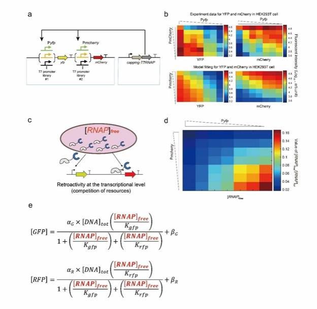 本论文发现了不同基因表达活性的竞争效应,并建立了定量的反应动力学模型。为了阐明两个基因的竞争效应,研究团队设计了一个哺乳动物细胞系中的两个报告基因(图2)。在这个双报告基因体系中,每个报告基因由正交型启动子库中的七个代表性启动子之一控制,共有49种不同的组合。实验结果发现一个基因的强启动子显著降低了另一个基因的表达。这个结果证明了两个报告基因在竞争有限资源( [RNAP]free)。因此,本论文提出了利用[RNAP]free取代的[RNAP]tot的新型反应动力学方程式(图2e)。