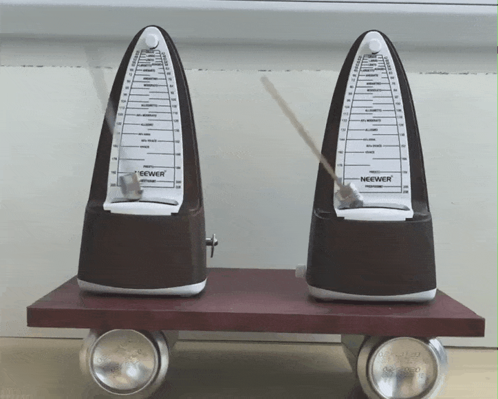 两节拍器通过底部木板相互作用形成反相同步(图片来自网络)