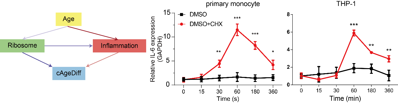 接下来,研究者建立线性模型定量刻画年龄相关特征在年龄增长过程中的变化,通过分析百岁老人的真实生理指标与预测值之间的差异,评估在健康长寿中被延缓的年龄相关特征。鉴定到随年龄增长的CD4-Tm细胞类型丰度,细胞类型特异性的病毒感染,细胞凋亡以及炎性细胞因子相关基因的表达, TNF家族和S100A8/A9受体-配体对介导的细胞间通讯,在SC中被显著延缓;随年龄减少的CD8-Naive细胞类型丰度和广泛的核糖体基因表达,在SC中也被显著延缓。研究者聚焦于伴随衰老进程下调的翻译活性和上调的炎症水平,发现在疾病模型中也存在和疾病进程相吻合的翻译活性下调和炎症水平上升。为了探究二者的因果关系,研究者通过贝叶斯分析推断出在高炎症细胞类型中核糖体水平可以负调控炎症水平,随后在人原代细胞和永生化细胞系中进行翻译活性抑制实验,验证了这种负调节关系。