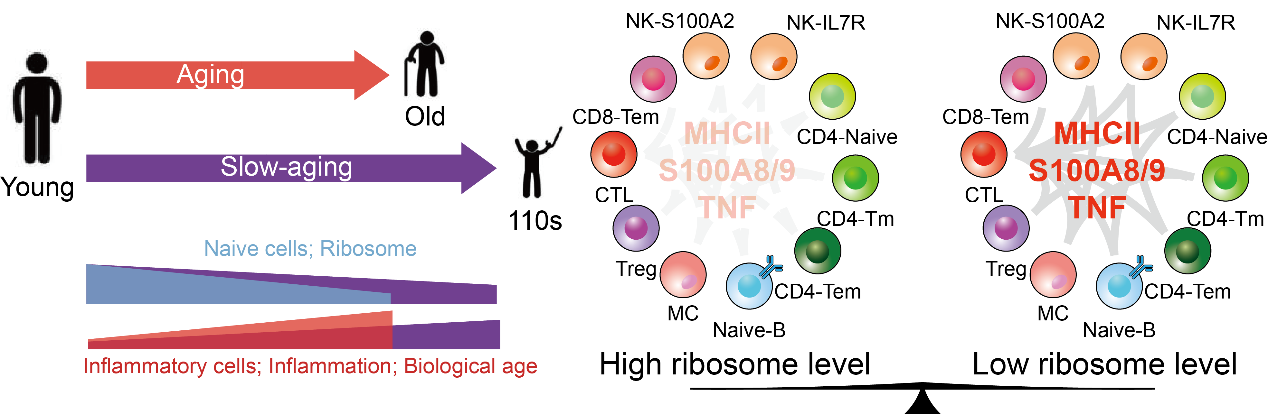 针对上述诉求和研究局限,2023年6月28日,北京大学韩敬东课题组与同济大学刘中民/朱鸿明课题组合作,于Science Advances发表题为“Human PBMC scRNA-seq based aging clocks reveal ribosome to inflammation balance as a single cell aging hallmark and super longevity”的研究论文,建立了人类连续衰老过程的循环免疫单细胞图谱,提出了第一个人类单细胞衰老时钟,并揭示了核糖体水平负调控炎症水平的平衡在衰老过程中的重要作用。