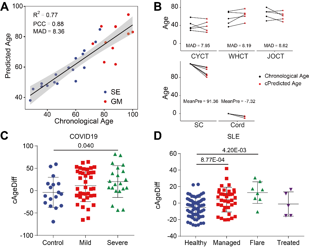 研究者使用偏最小二乘(PLSR)模型和弹性网络(EN)模型,以SE队列的数据为训练集,建立了的基于细胞丰度的衰老时钟。通过使用GM队列进行模型迭代更新,得到了平均绝对偏差(mean absolute difference, MAD)为8.36的衰老时钟。由于单细胞免疫衰老时钟也像其他衰老时钟一样,具有将年轻人预测变老,老年人预测偏年轻的系统误差,研究者对模型进行了年龄矫正。在独立验证数据集中,矫正的衰老时钟展现出较强的泛化性能,并且将百岁老人(SC)的生理年龄预测到80到102岁,而Cord队列的平均预测年龄为-7.32岁。在两种疾病数据集中,预测的生理年龄也随着疾病严重程度的增加而显著增加。结果表明,建立的衰老时钟能够精细评估样本的衰老状态和健康状态,并且有不断拓展和临床应用的潜力。