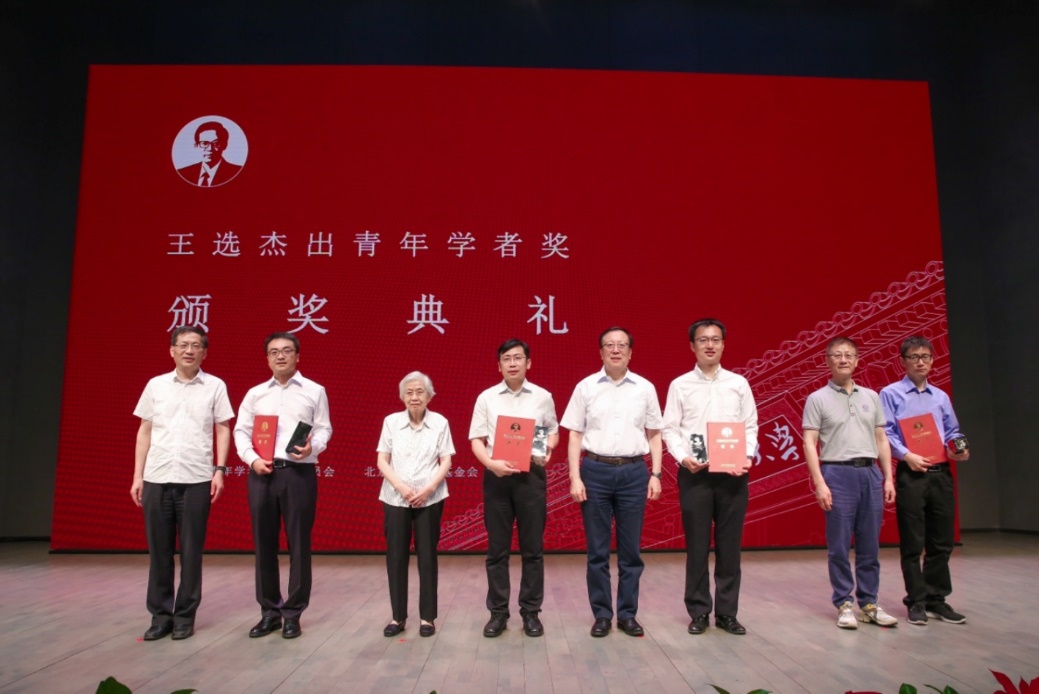 王选杰出青年学者奖颁奖典礼现场,校党委书记郝平教授和王选院士夫人陈堃銶教授共同为获奖者颁奖。右三为张磊