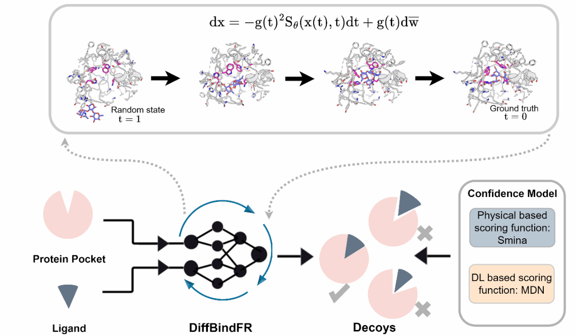 针对以上存在的问题,北京大学来鲁华、裴剑锋团队发展了基于扩散模型(diffusion model)的受体柔性对接构象生成方法DiffBindFR。DiffBindFR使用基于消息传递的 SE(3)-等变网络编码蛋白质口袋和配体分子之间全原子的复杂相互作用。整个模型将柔性对接定义为一个学习四个变量在其切空间中的联合去噪过程的问题,包括:配体旋转 R、平移 T、可旋转键扭转 τ 以及口袋侧链扭转χ。生成的多个对接构象利用confidence model挑选出排名第一的构象作为最终对接结果(图1)。