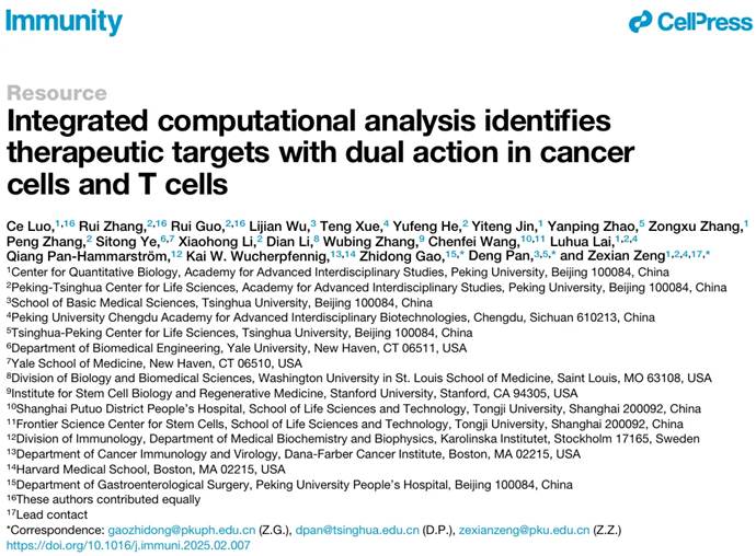 2025年2月28日,北京大学曾泽贤团队及合作者在Immunity上发表了研究论文Integrated computational analysis identifies therapeutic targets with dual action in cancer cells and T cells。在本研究中,作者开发了ICRAFT (https://icraft.pku-genomics.org),一个基于CRISPR组学的肿瘤免疫靶点鉴定平台,并系统性揭示了能在肿瘤和免疫细胞中具有双重免疫调节作用的关键基因,为提高免疫治疗的有效性提供了新的策略。
