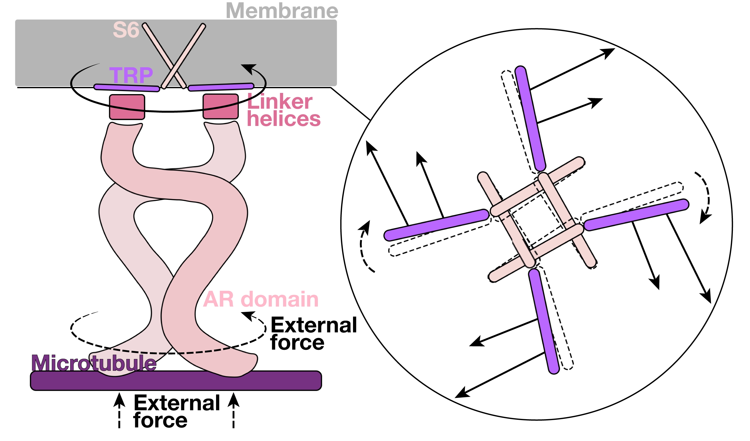 Jingze Duan's first paper focusing on NOMPC has been published online in eLife (Link). NOMPC, a mechanosensitive ion channel from the TRP family, converts mechanical stimuli into ionic signals to excite neurons. Using all-atom molecular dynamics simulations, we identified that torque on the TRP domain toward the extracellular side directly drives channel opening, with compression and twisting of the AR domain coupling to facilitate this process. These findings support a twist-to-open gating model mediated by the AR domain's compression-twist coupling. Congratulations!