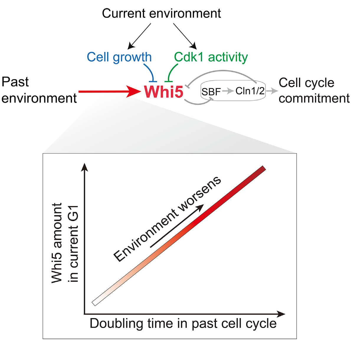 通过从单细胞水平对Whi5的蛋白合成速率和降解速率的测量,我们进一步发现了Whi5蛋白水平响应细胞周期变化的分子机制。Whi5 蛋白在细胞周期内的平均合成速率不随环境而改变,且在整个细胞周期过程中并不降解,而随时间不断积累。在这些机制调控下,Whi5蛋白水平只与细胞周期时间长短有关。因此,复杂的环境信息可定量转化为Whi5蛋白水平。通过这一机制,Whi5蛋白可以对历史环境条件进行记忆,芽殖酵母根据这一量化的历史环境信息决定新一次细胞分裂何时起始。