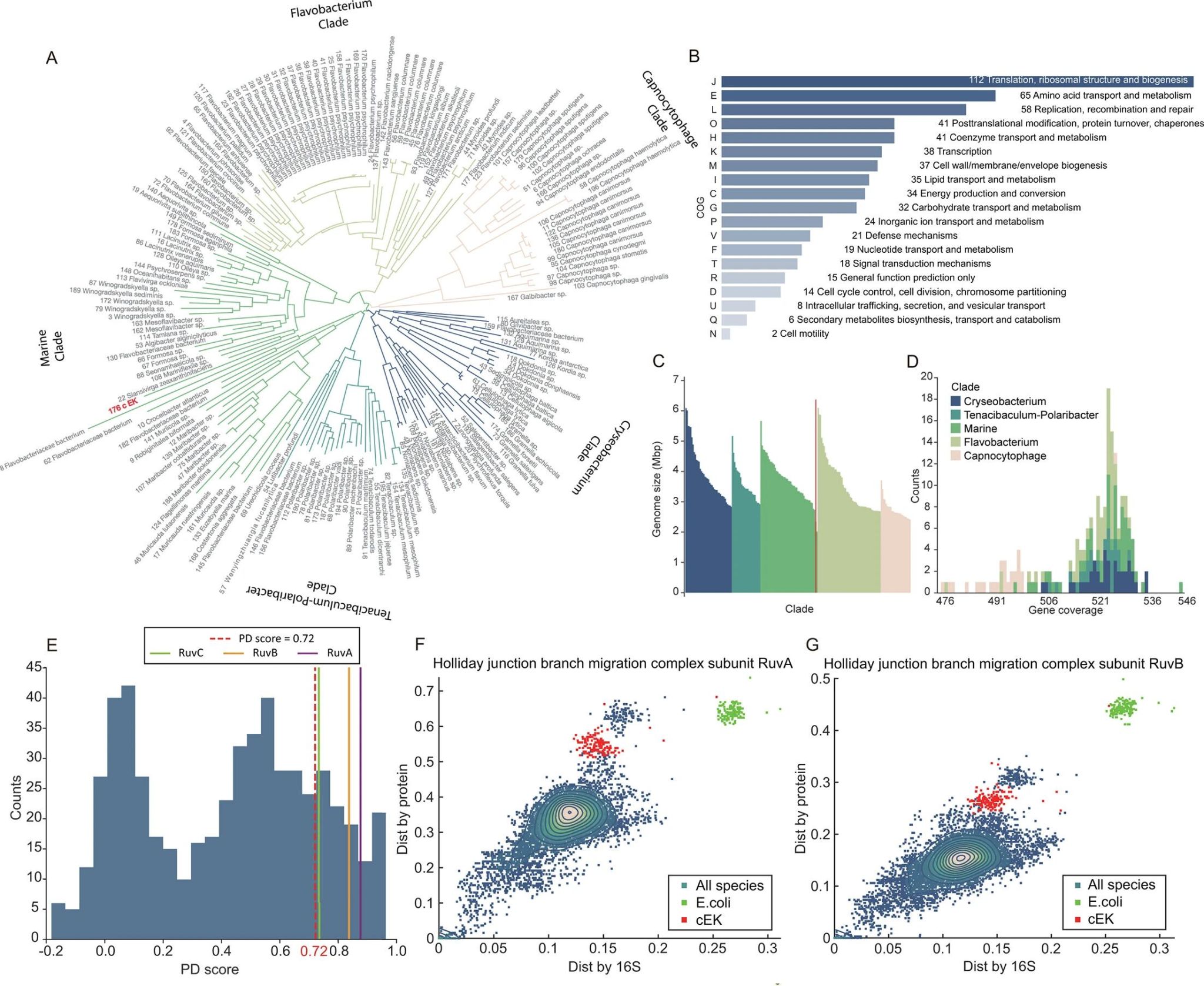 文中图2概述了基因组数据和PD分数计算, 包括197种物种的16S rRNA系统发育树(A)和RuvA(F)和RuvB(G)的蛋白距离 vs. 16S rRNA距离散点图,用于显示PD距离的直观理解。