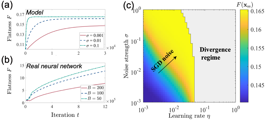 On the other hand, stochastic gradient descent (SGD), an optimization algorithm widely used in this field, plays a crucial role in finding flatter solutions with better generalization performance. It updates the parameters by randomly selecting small batches of samples during the iteration process, which can be seen as adding additional noise to the gradient descent. The covariance matrix of this noise is highly correlated with the Hessian matrix, indicating that the dynamical system has a special anisotropic noise: the noise intensity is higher in the sharp directions and lower in the flat directions (Figure 1b). Furthermore, modifying the hyperparameters of stochastic gradient descent, such as the learning rate and batch size, also affects the noise strength, ultimately influencing the generalization ability of the solution. This phenomenon is known as the implicit regularization effect of stochastic gradient descent, and it still lacks a comprehensive theoretical explanation behind it.