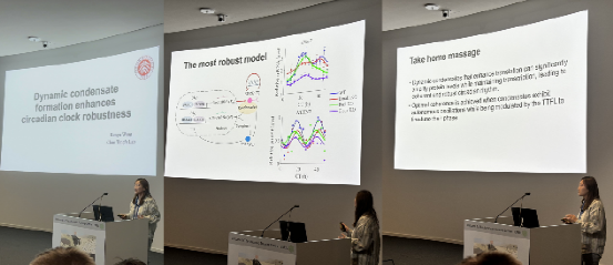 Wang Renyu presented her work titled "Dynamic condensate formation enhances circadian clock robustness" at the symposium. Her research, based on mathematical modeling, investigates how dynamic phase separation synergizes with genetic feedback regulation to enhance the robustness of the circadian clock. The study reveals that dynamic phase separation promotes protein translation, significantly increasing protein amplitude and leading to more coherent and stable circadian rhythms. Furthermore, the system achieves optimal rhythmic coherence when phase-separated condensates maintain autonomous oscillations while being phase-tuned by the transcription-translation feedback loop (TTFL).