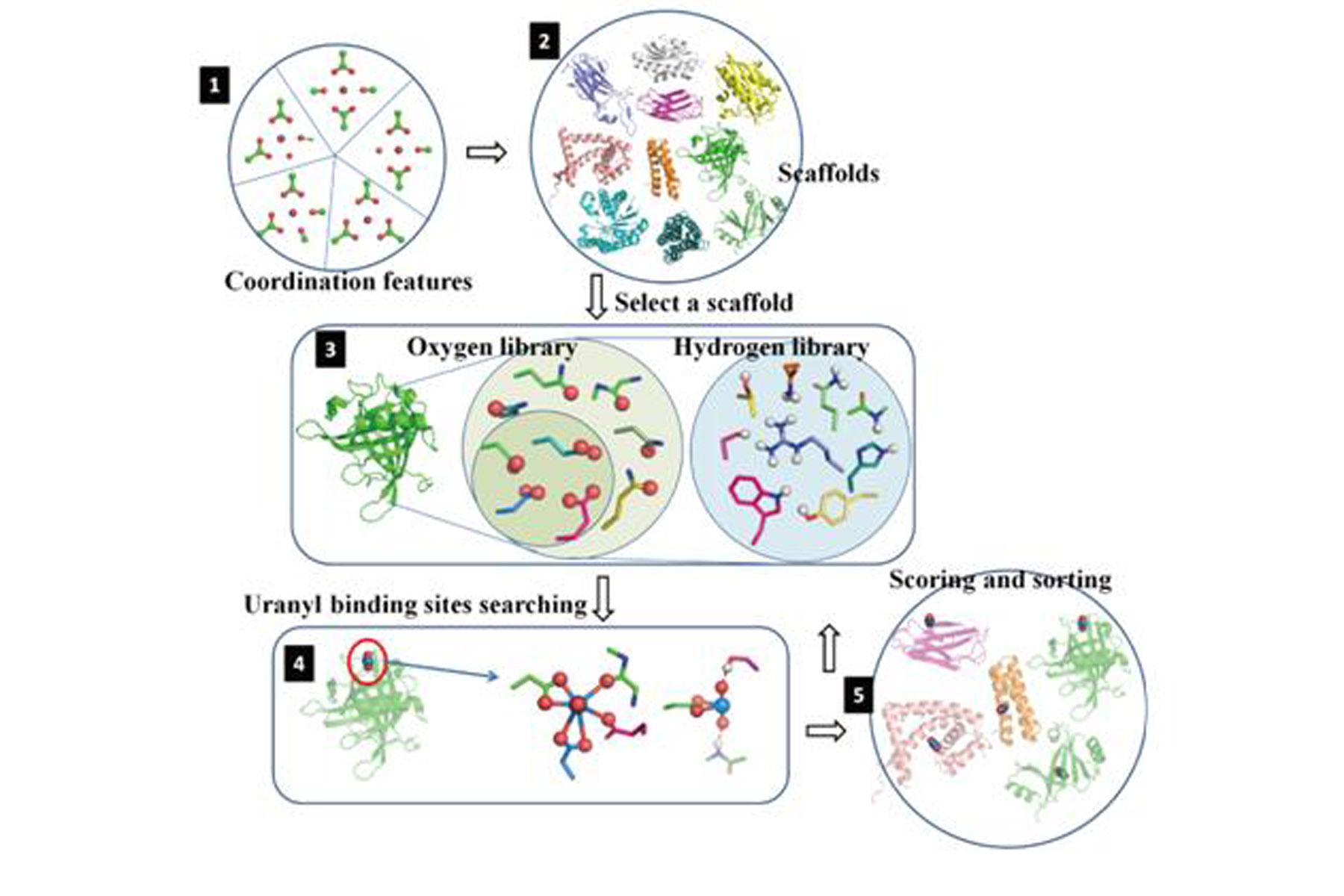 Figure 1. The main steps in computational screening and design uranyl binding proteins