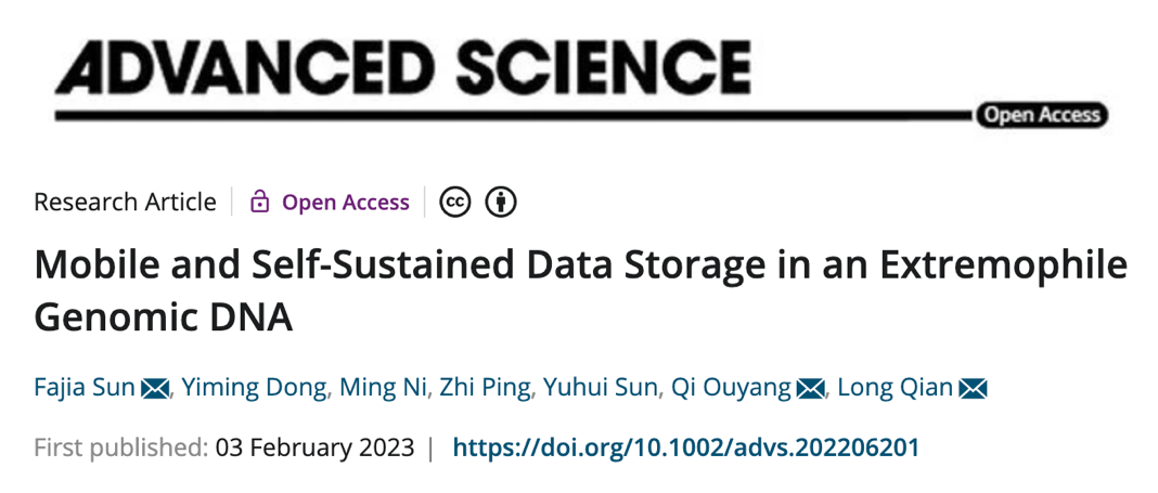 2023年2月3日,北京大学定量生物中心钱珑/欧阳颀团队在Advanced Science在线发表了题为“Mobile and Self-sustained Data Storage in an Extremophile Genomic DNA”的研究论文,该研究在细菌中建立了一套便携式、可自我维持的DNA数据存储系统,用来实现双模式存储、动态数据维持、快速信息检索和稳健的数据恢复。