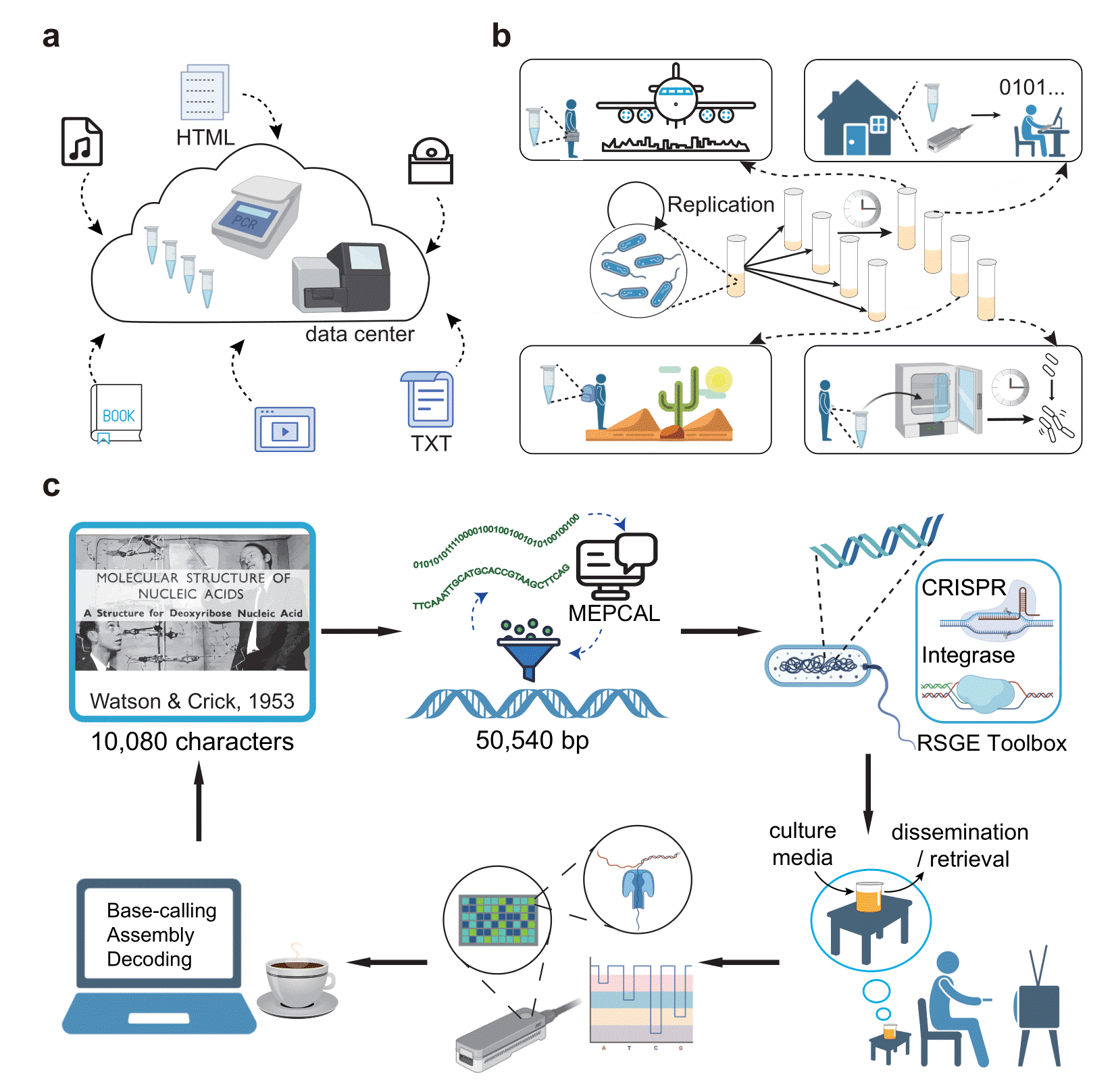 图1 使用RSGE工具箱,将存储人工信息的DNA片段整合到细菌基因组中。