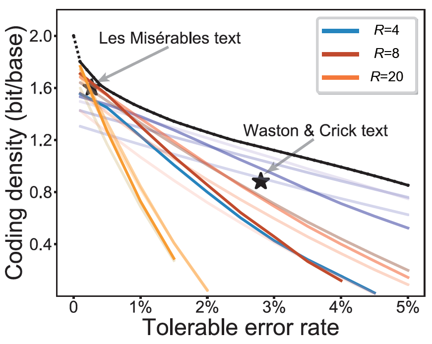 最后,作者基于MEPCAL开发了一个DNA编码的数学模型,以指导在不同的预期序列错误率下选择参数组合,来实现编码密度和解码稳定性之间的最优权衡。使用这一模型的预测结果,对更大规模的数据进行了编码测试,结果表明MEPCAL可以被应用于大规模数据存储而不会出现显著的性能衰退。上述结果表明,MEPCAL具有优良的稳健性和可扩展性,可以满足实际应用的需求。