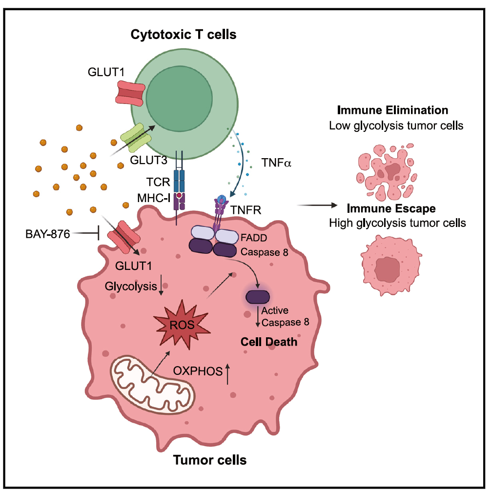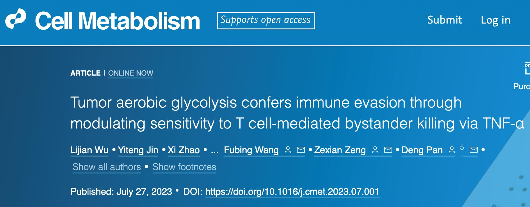 2023年7月27日,北京大学定量生物学中心(CQB)曾泽贤团队与清华大学医学院潘登团队,以及武汉大学中南医院汪付兵团队合作在Cell Metabolism上发表了题为 Tumor aerobic glycolysis confers immune evasion through modulating sensitivity to T cell-mediated bystander killing via TNFα 的研究论文,发现抑制肿瘤糖酵解和葡萄糖转运体1(Glut1)会增强 CTL对肿瘤细胞的杀伤。在机制方面,Glut1 失活会导致肿瘤氧化磷酸化水平(OXPHOS)上升,从而产生过量的活性氧化物(ROS),后者促进TNFα介导的细胞死亡。通过Glut1特异抑制剂BAY-876可使多种小鼠肿瘤细胞对抗肿瘤免疫更敏感。此外,由于CTL高表达另一个葡萄糖转运蛋白Glut3,抑制Glut1对CTL功能的影响相对较小。因此,靶向Glut1为肿瘤免疫疗法提供了新的治疗思路。