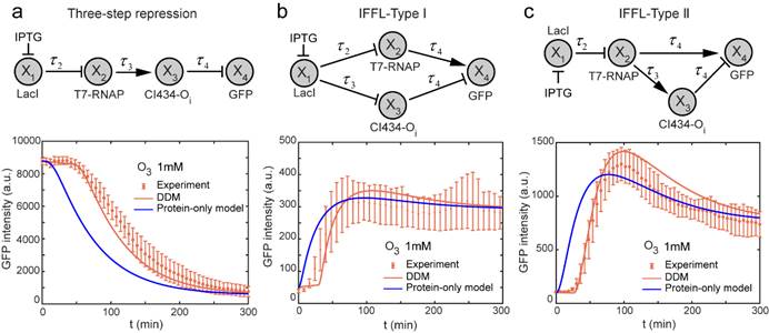 最后,研究团队利用参数刻画完成的调控元件拼搭了三种不同的基因调控回路,包括简单的三步调控回路和两个结构不同的不一致前馈回路,发现动力学延迟模型相对于传统不考虑延迟的模型可以更加准确地描述基因调控回路的动力学表达过程(图2)。