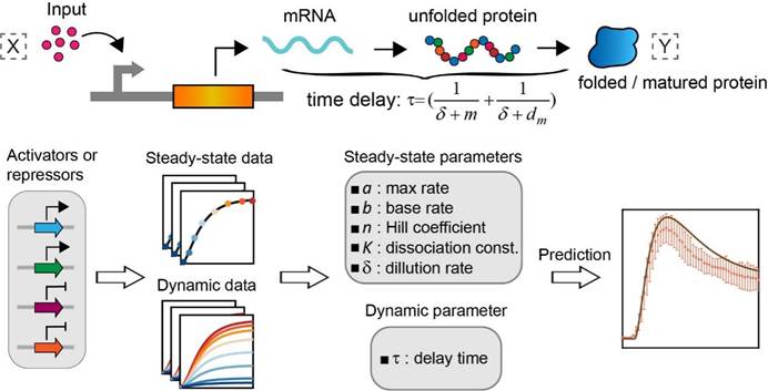 图1 转录、翻译和蛋白折叠等过程会导致一定的时间延迟。利用动力学延迟模型分别拟合剂量响应曲线和动力学响应曲线可以分别得到对应的参数,最后对拼搭得到的基因回路的动力学表达过程进行预测。