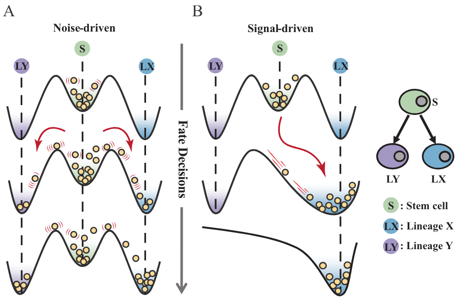 图1. 细胞命运决定过程中两种驱动力模式在经典Waddington景观下的示意图