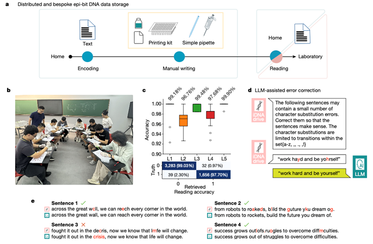 值得关注的是,团队还展示了这项技术的分布式存储应用潜力。在个人定制DNA存储(iDNAdrive)的实验中,团队邀请了60名背景广泛的青年志愿者,由他们在非专业环境下(普通教室),将私人数据亲手写入DNA,相关数据直到测序才能够被解读。这种分布式DNA存储方式,不仅能极大降低DNA存储的使用门槛,且保障了数据隐私,有望推动DNA存储的个人应用(图3)。