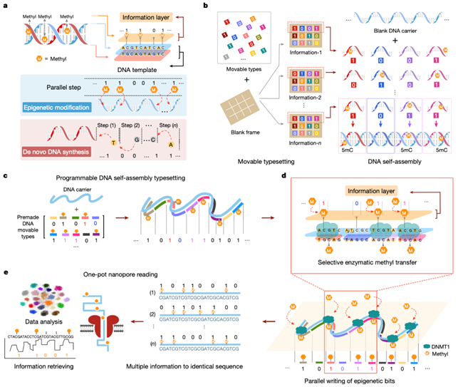 图1. 表观比特DNA存储的基本原理(a-b)和流程(c-e)。