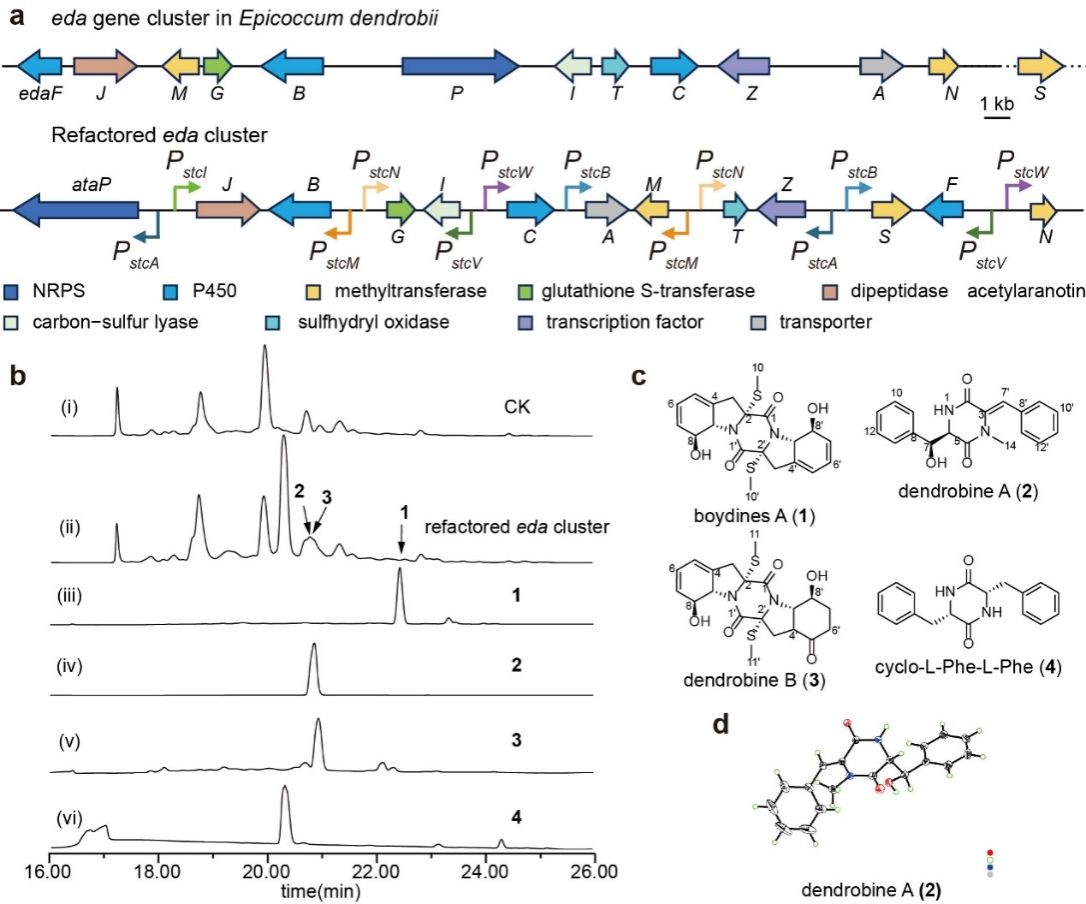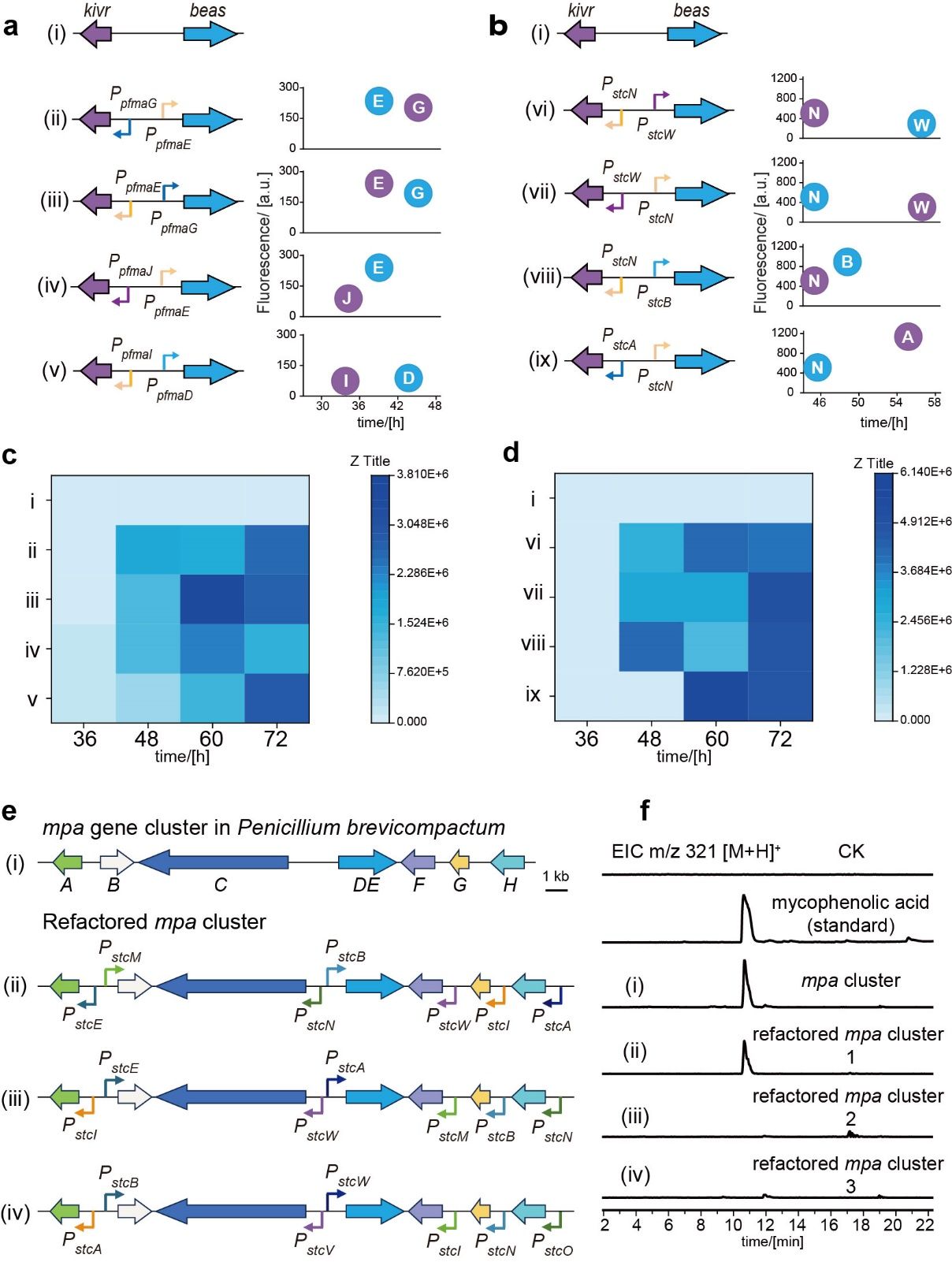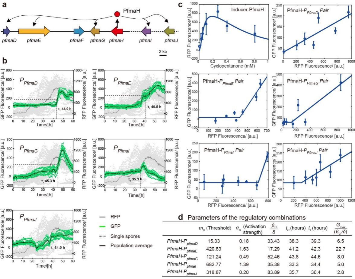利用这一微流控平台,在单细胞水平上对参与PfmaH-GRC(图2)和AflR-GRC(图3)中的调控组合进行定量表征。分别将两个调控回路中的转录因子与红色荧光蛋白基因融合,将启动子与绿色荧光蛋白基因融合,构建共30个双荧光标记的菌株。将荧光标记的丝状真菌分生孢子在定制的微流控芯片上培养60小时,收集实时荧光数据。其中来自PfmaH-GRC的5个调控组合被进一步精确拟合分析,并用数学模型描述了调控元件的特征。然后,作者将定量化的调控元件用于重构药物分子白僵菌素(beauvericin)和霉酚酸(mycophenolic acid)的生物合成途径,并精确地控制了它们的产生(图4)。在这一过程中,作者发现使用启动时间接近的启动子重构生物合成途径有助于化合物的产生,同时,启动子启动顺序与化合物生物合成步骤一致时,成功产生化合物的概率更高。进一步,作者利用定量化的调控元件成功激活的石斛附球菌(Epicoccum dendrobii)中的1个二酮哌嗪类次级代谢产物合成基因簇(图5)。