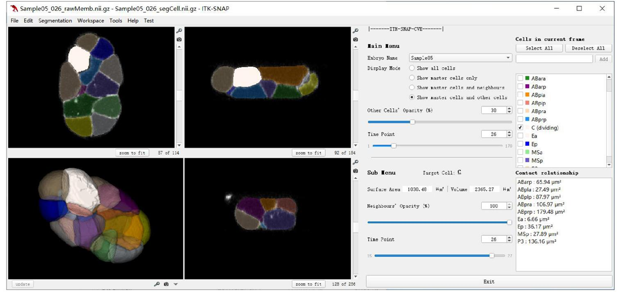 研究团队进一步从以往文献和新培养的线虫胚胎中收集超过400个基因的单细胞表达图谱。本文章数据可以通过ITK-SNAP-CVE(C. elegans virtual embryogenesis;https://doi.org/10.6084/m9.figshare.24768921)软件和CMOS(cellular morphology of C. elegans embryo; https://bcc.ee.cityu.edu.hk/cmos)网站访问(图6、图7)。研究团队成功结合Notch信号配体/受体表达谱、细胞体积、细胞接触识别出5组新的信号配对,并通过信号阻断和激光销蚀实验独立验证。