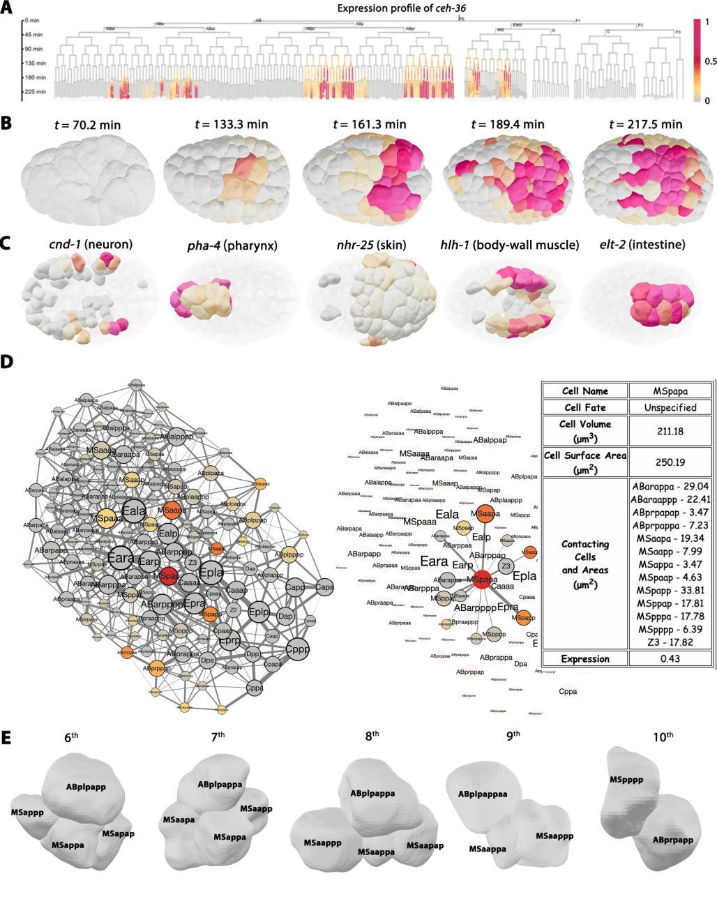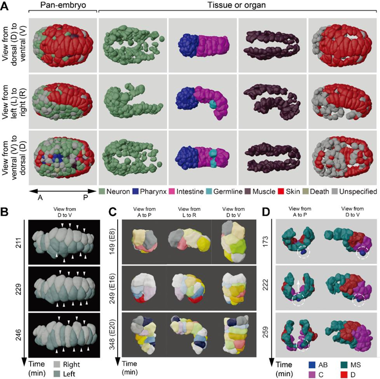 研究团队首先对线虫胚胎以小于1.5分钟的时间间隔进行三维拍摄,拍摄时间不少于6小时,其中细胞核被绿色荧光标记(用于细胞身份追踪),细胞膜被红色荧光标记(用于细胞形态重构)。最终研究团队获得一共8个野生型胚胎、共约40万个独立的三维细胞区域,覆盖从受精后第一次分裂完成到胚胎伸长期,记录超过95%的胚胎细胞。伴随的定量信息包括细胞身份、谱系、命运、形状、体积、表面积、接触关系与接触面积。该延时三维数据能够被用来定性和定量刻画不同谱系、组织器官的形态动力学(图2、图3)。