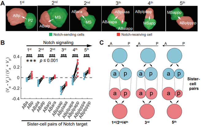 细胞形态常常以多种功能特征参与到发育过程,比如以Notch为代表的邻居细胞信号转导整合细胞接触关系和接触面积,诱导后续咽喉、头部、肾脏的分化 [9]。因此,研究团队进一步从细胞形态数据提取体积、表面积、接触关系与接触面积,继续考察Notch信号如何控制细胞分化。研究团队参考前人报道的Notch配对细胞,发现接收信号(或更强信号)的细胞在分裂过程中会产生更大的头部子代细胞。这种体轴不对称性在6组配对细胞里毫无例外,并通过信号阻断实验得以独立验证(图4)。