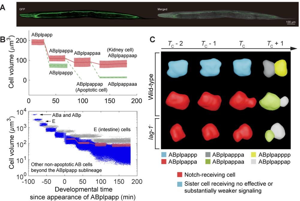 研究团队继续好奇该体积不对称性是否可能具备生理学功能。此前线虫第4次Notch信号已经被发现对肾脏细胞(单细胞器官)在分子层面上起诱导分化作用,该单细胞在成体内具备显著的大体积并贯穿个体 [9]。研究团队发现除过去报道的信号接收细胞以外,其后续两轮分裂依然受信号影响,从而通过多轮不对称分裂使最终的肾脏细胞成为AB谱系(首个体细胞谱系)内最大的细胞(图5)。