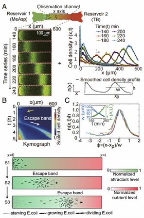 北京大学物理学院/北京大学定量生物学中心欧阳颀院士领导的“生物物理”团队的罗春雄研究组在基于微流体细菌趋化分析芯片的实验研究中发现:在反向不同引诱物浓度梯度下,细菌首先趋向聚集于强引诱物而少营养的一端, 但当细胞密度超过一个阈值时,细菌群落部分“逃逸”强引诱物浓度场,游向趋化因子相对弱但可代谢物质富集的一端。这一现象被刻画为细菌群体运动的“逃逸相变行为”。罗春雄研究组通过与美国IBM沃森研究中心的涂豫海教授(北大定量生物学中心资深访问学者)合作,对此现象涉及的趋化受体间的协作行为进行了系统细致的理论分析和实验论证,发现营养物质通过数量较少的Tap趋化受体进行了响应行为,而且在较大的一个趋化响应参数空间均会出现由细菌密度超过临界密度而产生的逃逸条带(“Escape Band”)行为,该行为可以使得细菌群落在复杂的趋化物浓度场中获得更好的生长优势。相关的定量实验与理论研究以“The escape band in Escherichia coli chemotaxis in opposing attractant and nutrient gradients”为题于2019年1月23日在线发表于Proceedings of the National Academy of Sciences of the United States of America(PNAS)杂志上。