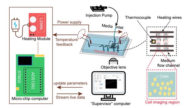 对细胞和生物体来说,应对复杂的环境变化是一个巨大的挑战,为了适应外界环境的变化,细胞进化出各种应激行为来维持自身的稳态。与单一变化的应激相比,细胞在渐变式、预处理和波动环境变化中表现出不同的适应行为。精确的温度控制在许多领域有着广泛的应用,例如细胞(植物、动物或微生物)的应激响应途径的研究,线虫的运动行为研究,果蝇胚胎的发育过程研究,温度引发的相分离机制研究等。然而,现有的生物热应激研究通常是在热处理一段时间后进行分析,忽略了动力学信号。此外,热处理条件通常是单一温度和群体水平,这限制了我们对细胞在复杂温度变化下的调节机制和生物应对行为的理解。从技术上讲,缺乏能够精确控制温度和复杂细胞生长形式的单细胞研究平台阻碍了我们对细胞和生物体在面对各种形式的温度变化时的反应策略的理解。