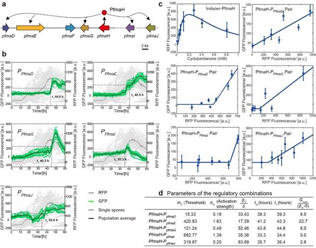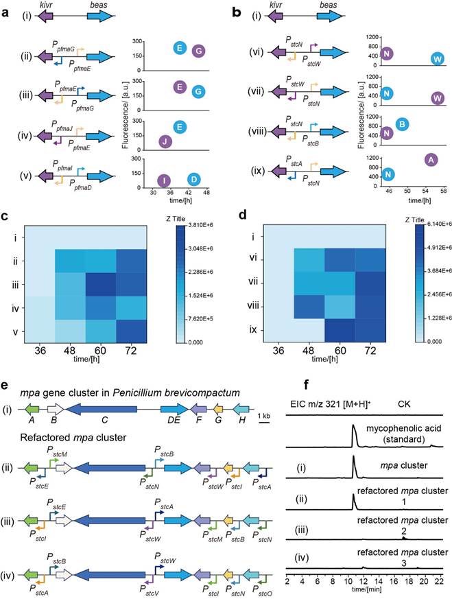 利用这一微流控平台,在单细胞水平上对参与PfmaH-GRC(图2)和AflR-GRC(图3)中的调控组合进行定量表征。分别将两个调控回路中的转录因子与红色荧光蛋白基因融合,将启动子与绿色荧光蛋白基因融合,构建共30个双荧光标记的菌株。将荧光标记的丝状真菌分生孢子在定制的微流控芯片上培养60小时,收集实时荧光数据。其中来自PfmaH-GRC的5个调控组合被进一步精确拟合分析,并用数学模型描述了调控元件的特征。然后,作者将定量化的调控元件用于重构药物分子白僵菌素(beauvericin)和霉酚酸(mycophenolic acid)的生物合成途径,并精确地控制了它们的产生(图4)。在这一过程中,作者发现使用启动时间接近的启动子重构生物合成途径有助于化合物的产生,同时,启动子启动顺序与化合物生物合成步骤一致时,成功产生化合物的概率更高。进一步,作者利用定量化的调控元件成功激活的石斛附球菌(Epicoccum dendrobii)中的1个二酮哌嗪类次级代谢产物合成基因簇(图5)。