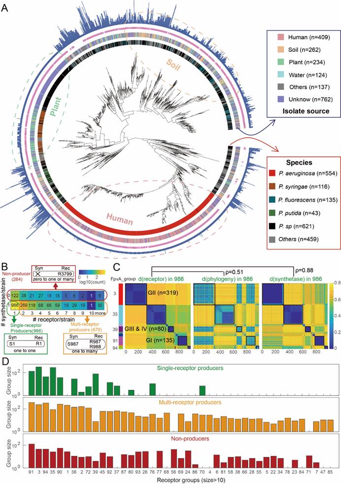 本研究使用1928株非冗余假单胞菌的数据集,数据集包括多种假单胞菌,主要来自人类(21.2%)、土壤(13.6%)、植物(12.1%)和水(6.4%)等栖息地,铜绿假单胞菌(P. aeruginosa)(28.7%)、荧光假单胞菌(P. fluorescens)(7.0%)、丁香假单胞菌(P. syringae)(6.0%)和恶臭假单胞菌(P. putida)(2.2%)数量最多(图1A)。研究发现三种pyoverdine利用策略:“单受体生产者”(51.1%),即具有一个pyoverdine合成基因簇和一个FpvA受体基因的菌株;“多受体生产者”(35.2%),即具有一个合成基因簇但有多个受体基因的菌株;“非生产者”(13.7%),即缺乏合成基因簇但有至少一个受体基因的菌株(图1B)。