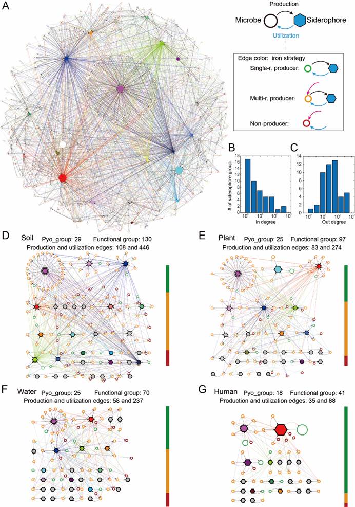 此外,研究还分别为来自土壤(262株)、植物(234株)、水(124株)和人类(409株)栖息地的菌株创建了单独的网络(图3D-G),发现不同栖息地的pyoverdine策略频率和网络拓扑结构有根本差异。例如,在土壤来源的菌株中,有56.9%的多受体生产菌、27.5%的单受体生产菌和15.7%的非生产菌。相比之下,人类来源菌株中只有10.0%的多受体生产菌和4.0%的非生产菌,但有86.1%的单受体生产菌。网络复杂度也因栖息地而异,土壤、植物和水栖息地的微生物功能组数量高于人类相关栖息地。60.7%的功能组仅在一个栖息地中出现,而只有8个功能组和11个pyoverdine组在所有四个栖息地中均有发现。这些结果表明,铁互作网络在不同栖息地中演化方式不同,但其背后成因仍需进一步研究。