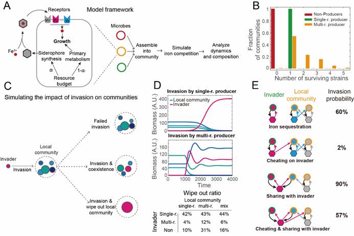 为了进一步探讨病原菌侵染与pyoverdine利用策略之间的关系,研究模拟了入侵者对稳态群落的入侵后果(图5C)。结果表明,单受体生产者和非生产者的入侵往往破坏局部群落(图5D),而多受体生产者则更可能融入并与局部群落共存。入侵成功的概率还受到入侵者(模拟为单受体生产者)与局部群落之间的pyoverdine锁-钥关系的影响(图5E)。如果局部群落能够欺骗入侵者的铁载体,入侵成功的概率接近零,相反,如果入侵者能够生产专一性铁载体,或局部群落中某一成员生产相同的铁载体,入侵成功的概率则较高。综上所述,单受体和多受体生产者的相对比例及其通过铁载体的相互作用对群落多样性和网络复杂性有根本性影响。