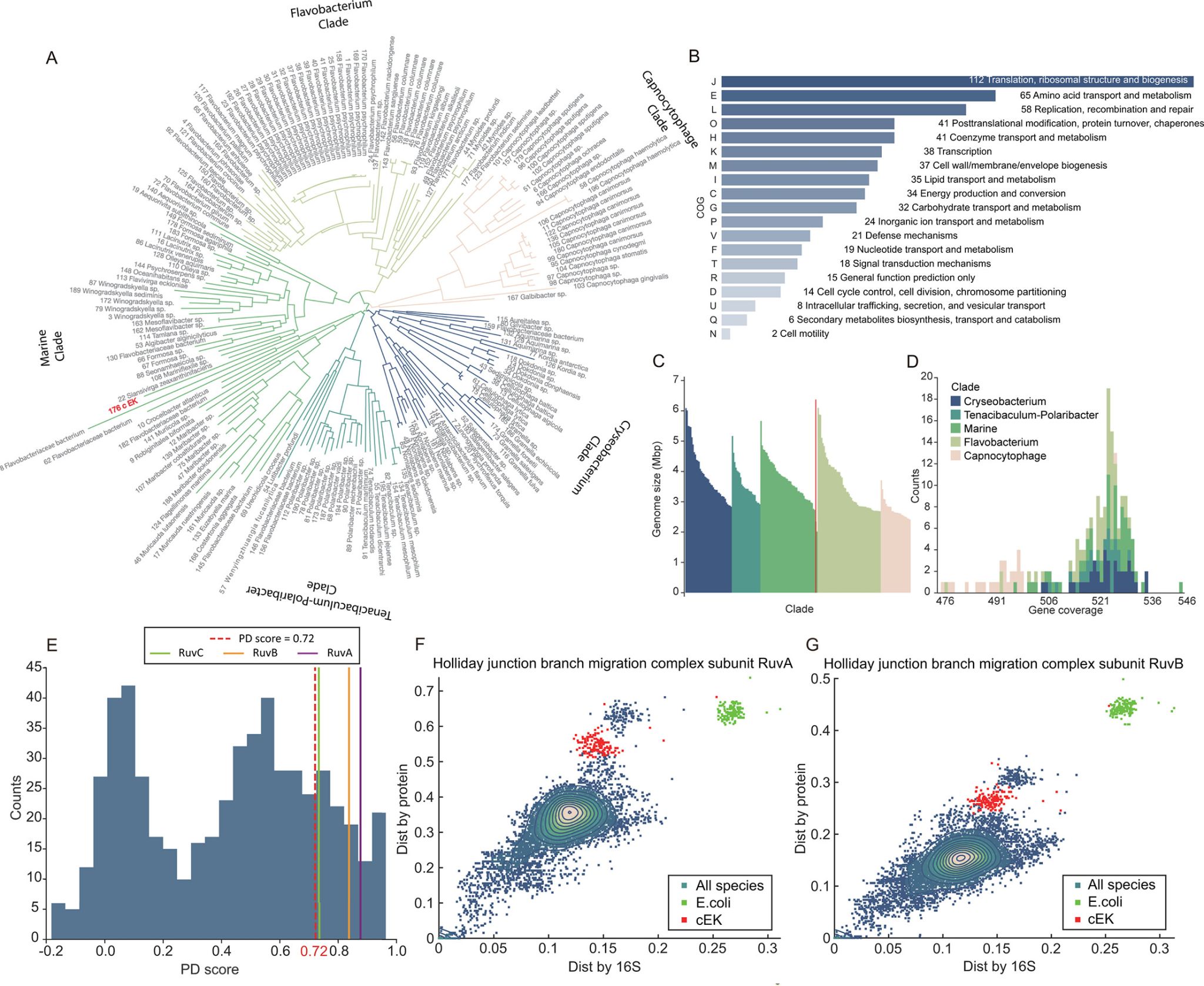 文中图2概述了基因组数据和PD分数计算, 包括197种物种的16S rRNA系统发育树(A)和RuvA(F)RuvB(G)的蛋白距离 vs. 16S rRNA距离散点图,用于显示PD距离的直观理解。