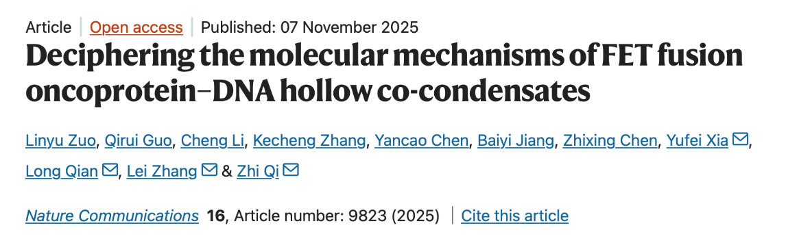 近日,北京大学定量生物学中心齐志课题组、张磊课题组、钱珑课题组与中国科学院过程工程研究所夏宇飞课题组在FET融合致癌蛋白形成球壳凝聚物的研究取得突破性进展。他们发现FET家族融合致癌蛋白FUS-ERG可与含GGAA微卫星序列的双链DNA(dsDNA)形成独特的球壳共凝聚物,并通过体外生化实验、超分辨成像与数学建模相结合的方法,揭示了其“嵌套不对称相分离”的形成机制”。更具独创性的是,研究人员基于FUS-ERG-dsDNA球壳共凝聚物的结构特性,研究人员开发出独特的DNA操控技术,成功实现DNA信息的精准删除及层级分选,为DNA存储领域提供了全新技术路径。相关论文“Deciphering the molecular mechanisms of FET fusion oncoprotein–DNA hollow co-condensates”已发表于Nature Communications。
