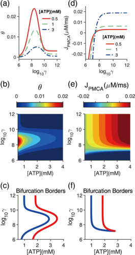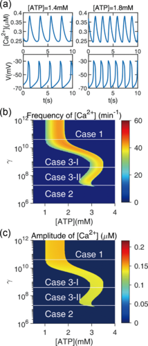 Keq为ATP水解反应的平衡常数。研究结果表明,通过改变参数[ATP]和γ可以使钙振荡系统从稳定态转变为振荡态。用非线性物理学的语言描述就是说系统发生了相变或者“分叉”。图2b-c展示了二维的[ATP]和γ的参数空间中,系统达到稳定后,钙振荡的振幅与频率;其中单一的深蓝的的区域是稳定态区域,也就是没有振荡产生的区域;而其他的有颜色的区域则表示存在钙振荡的区域。其振幅或频率的数值分别由其颜色表示。就振幅而言,振荡区的振幅几乎维持不变,然而振荡区的频率在边界处会有明显的下降。而振荡区和非振荡区两个区域的边界就是之前所说的 “分叉”发生的地方。