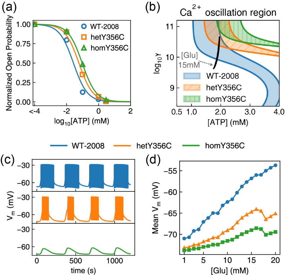 图5 野生型与SUR1-Y356C突变的KATP通道。(a)突变抑制ATP关闭KATP通道的能力,实线为模型拟合,点为实验结果。(b)突变导致钙离子高频振荡区向右上移动。(c-d)突变导致下游高频振荡时间减少与平均膜电位响应减弱。