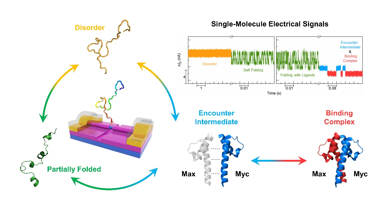天然无序蛋白质(IDP)是一类生物体内广泛存在的没有固定结构的蛋白质,在基因转录调控等生物学过程中发挥重要作用,是潜在的药物靶标。然而,IDP高度动态的结构给研究相关的分子识别过程和药物设计带来了很大的困难。近日,北京大学化学与分子工程学院/前沿交叉学科研究院定量生物学中心/北大-清华生命科学联合中心来鲁华课题组与北京大学化学与分子工程学院郭雪峰课题组开展合作,采用基于硅纳米线场效应晶体管(SiNW-FET)的单分子生物传感器,成功实现了对天然无序蛋白c-Myc的单分子构象动力学的无标记、实时动态监测(图1)。相关研究近日以“Visualizing single-molecule conformational transition and binding dynamics of intrinsically disordered proteins”为题在线发表在Nature Communications(Nat. Commun. 2023, 14 , 5203. DOI: 10.1038/s41467-023-41018-x)期刊上。这项研究成果为深入理解天然无序蛋白的特性及其与其他分子间相互作用的动态过程提供了新的研究手段。