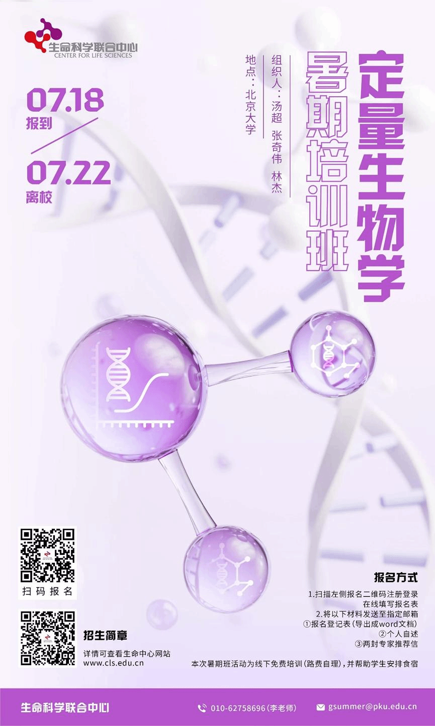其中,定量生物学暑期班是这些培养活动中的重要组成。定量生物学是一门结合数学、统计学和计算方法来研究生物系统和过程的跨学科领域,旨在通过数据驱动的模型揭示生命现象的规律。欢迎全国有志于加入生命科学交叉科学前沿队伍的化学、生物、物理、数学、计算机、医学、电子信息及工学等各学科的在读本科生积极报名。
