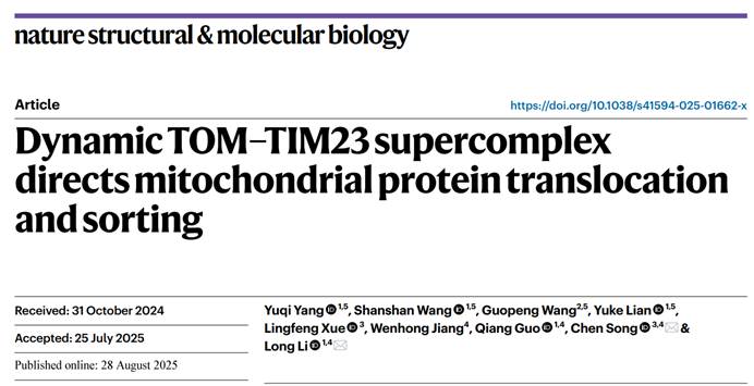 2025年8月28日,北京大学生命科学学院李龙课题组与定量生物学中心宋晨课题组合作,再次在Nature Structural & Molecular Biology在线发表研究论文“Dynamic TOM–TIM23 supercomplex directs mitochondrial protein translocation and sorting”,解析了TOM–TIM23超级复合体在转运多肽底物状态下的高分辨率冷冻电镜结构,分析其动态过程,首次在分子水平揭示了内膜TIM23复合体如何根据底物疏水性控制蛋白进入基质或插入内膜,并阐明了其区别于内质网上的经典蛋白转位通道Sec的全新转位机制。