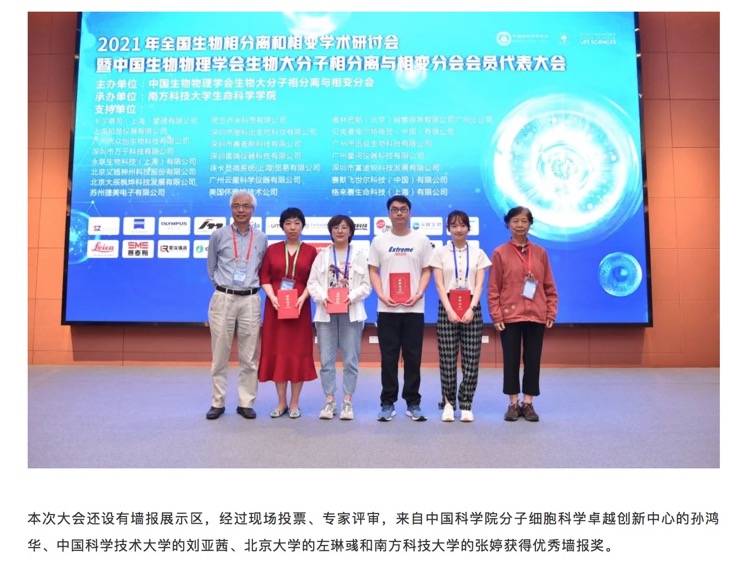 2021/04/12 恭喜左琳彧(右二)的墙报Single-molecule imaging of FET fusion oncoproteins loci-specific condensates在2021年全国生物相分离和相变学术研讨会中获得优秀墙报奖。