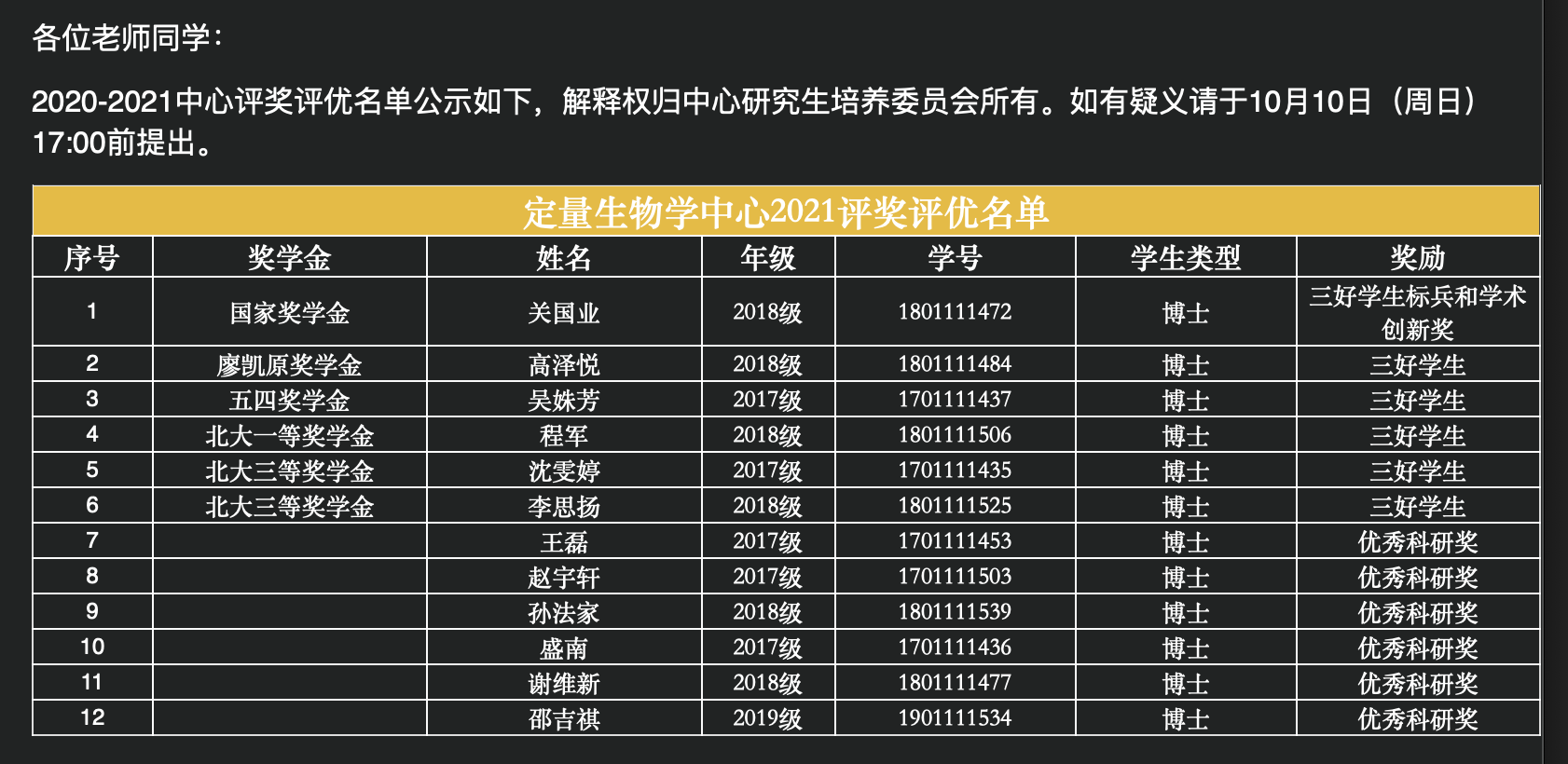 2021/10/11 祝贺程军同学获得北大一等奖学金!