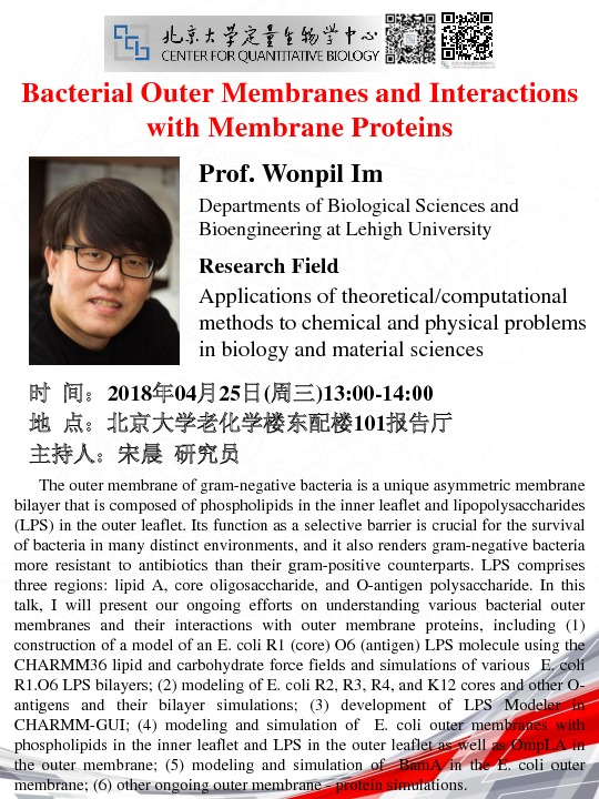 Invited and hosted by Dr. Chen Song and Shasha Feng, Prof. Wonpil Im, the leading scientist of the CHARMM-GUI, G-LoSA and ST-analyzer projects, visited us and gave a seminar entitled “Bacterial Outer Membranes and Interactions with Membrane Proteins” at CQB.