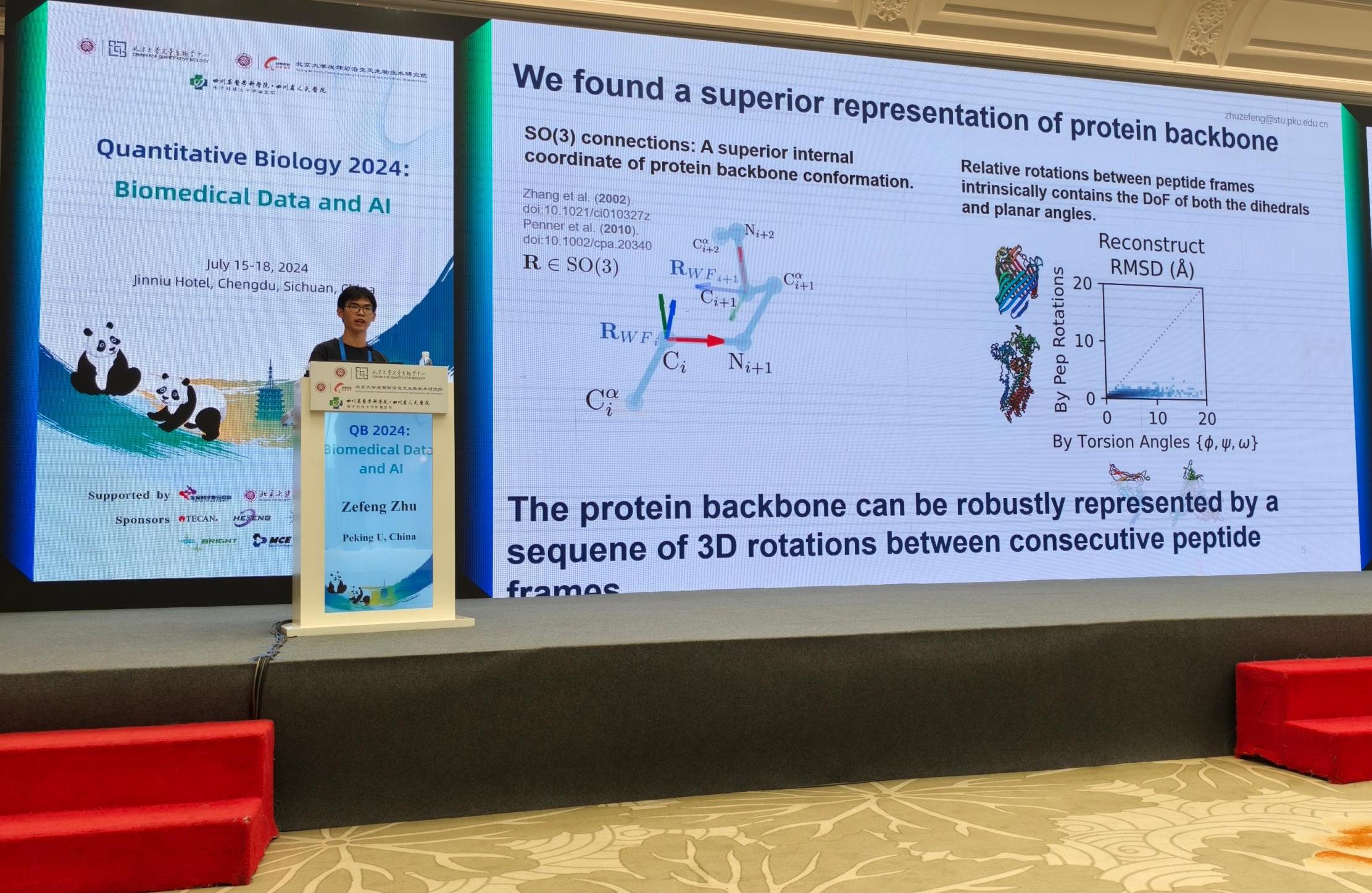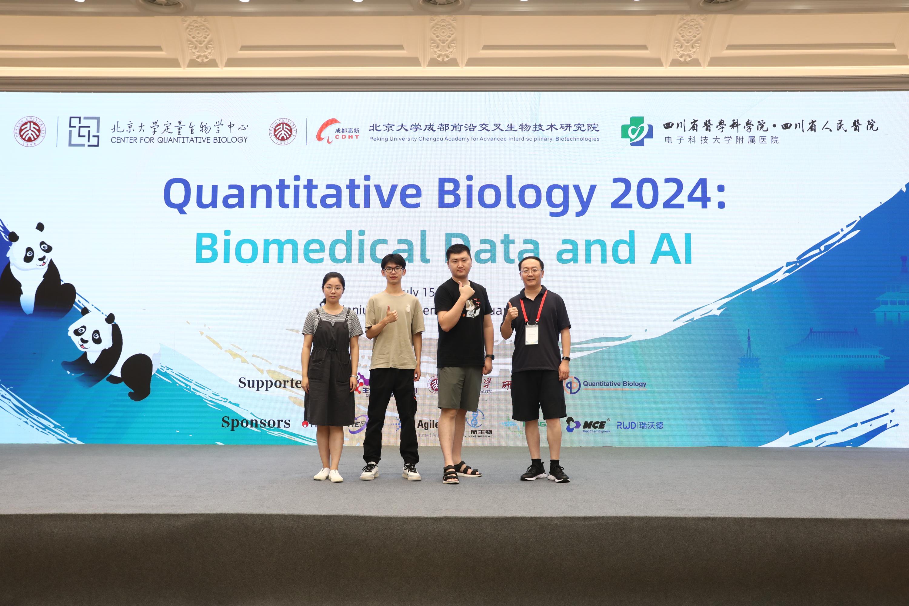 The Quantitative Biology 2024: Biomedical Data and AI conference was held in Chengdu, China, from July 15 to 18, 2024. Some members of our group, including Prof. Chen SONG, Kai, Zefeng, and Ruihan attended the conference. A special highlight was Zefeng's presentation of his novel model, FoldPolicy, along with his talk titled "Probabilistic matching and decoding of protein conformations".